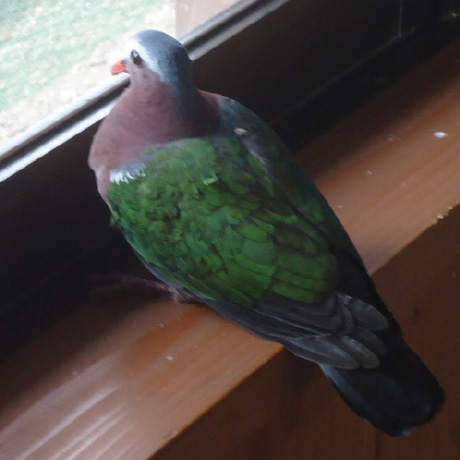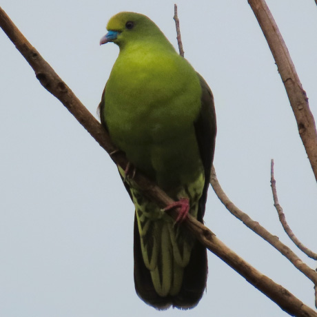 全身が鮮やかな緑色をしたハトで、くちばしはコバルトブルー、目は赤く、とても美しい鳥です。「ポワーーー」と尺八のような独特の声で鳴くのが特徴です。竹富島では、雨上がりに電線に並んで羽を休める姿や、庭先の木に巣を作る様子が見られることがあります。島でも身近な鳥として親しまれています。