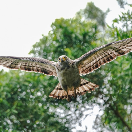 全長約55cmの小型のワシで、国の特別天然記念物に指定されています。石垣島と西表島におよそ200羽が生息しています。竹富島でもまれに姿を見かけることがありますが、繁殖は確認されていません。成鳥は灰色から茶褐色の羽をもち、幼鳥は全身が白色です。威嚇をするときに頭の羽を冠のように立てる姿が名前の由来です。