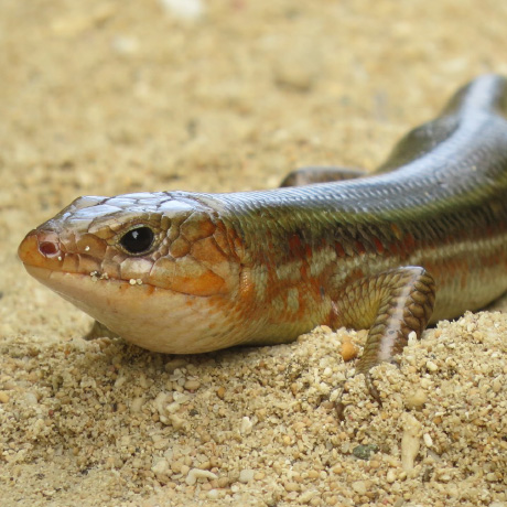 国の天然記念物に指定されている大型のトカゲで、体長は30〜38cmが多く、40cmほどに成長する個体もいます。体色は光に当たると金色に輝き、とても美しい姿が特徴です。竹富島では姿を見ることはまれですが、岩の上で日光浴をしているところを見かけることもあります。