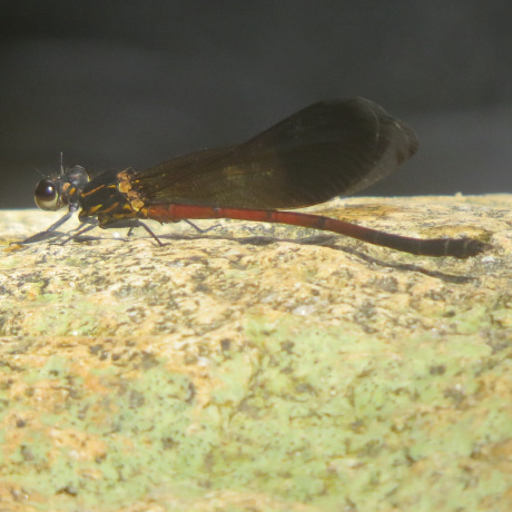 水辺で見られる小型のトンボで、体長は約3〜4cmです。 体は黒色で光沢があり、オスの後羽には黒い帯のような模様が、腹部は赤みを帯びています。