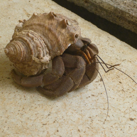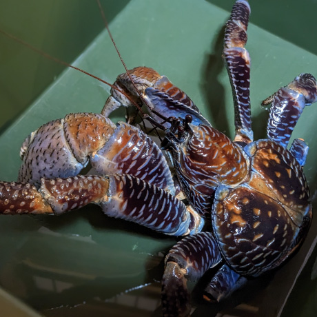 世界最大級のヤドカリで、体長は30cmほどに成長します。体は濃い青や紫色で、木の枝や貝殻を砕くことができる大きなハサミが特徴です。竹富島では、浜辺や林の中でアダンの実などを食べて生活しています。