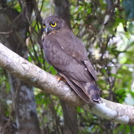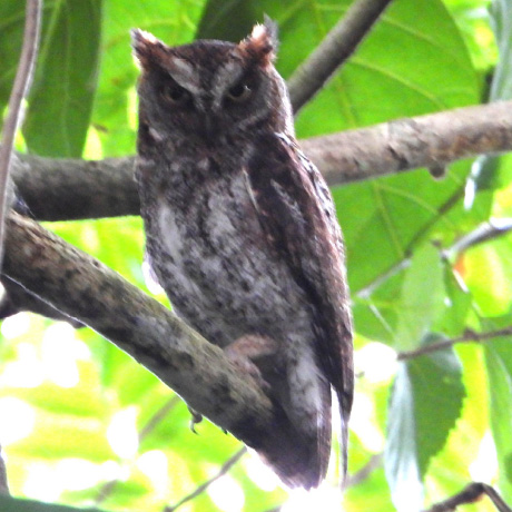 全長約29cmの小型のフクロウで、竹富島では一年を通して見られる留鳥です。夜になると、「ホォッーホッ」と低く特徴的な声が森の中から聞こえてきます。日中は木の枝や建物の陰で静かに休み、夜になると昆虫などを捕まえて活動します。