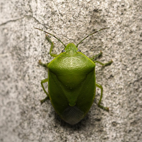 日本全国で見られるカメムシの一種で、竹富島でも葉の上や木の枝で見かけることがあります。 体長は約1.5〜2cmほどで、鮮やかな青緑色の光沢のある体が特徴です。 刺激を与えると強いにおいを出して身を守ります。