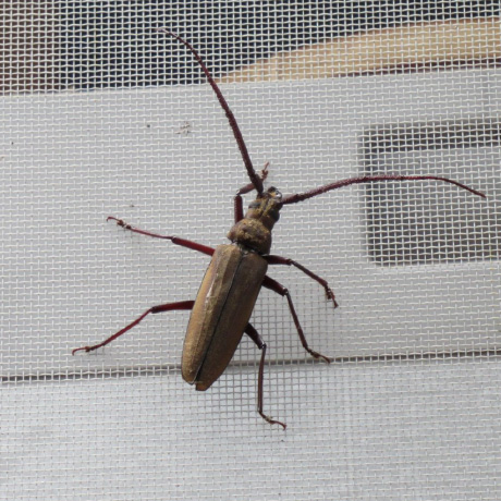 日本全国に分布する、日本最大級のカミキリムシです。 体長は約3〜6cmで、大きな顎が特徴です。 夜行性で、夜になると街灯や民家の明かりに集まることがあります。 樹木の幹や枝に止まって活動し、木の樹皮や葉を食べます。