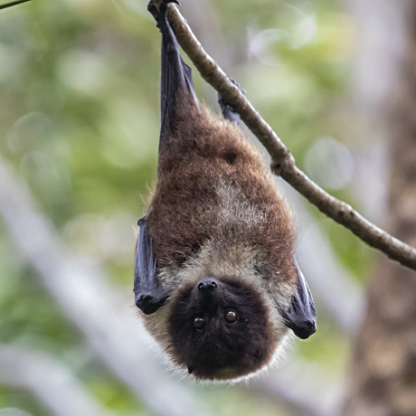翼を広げると約70〜80cmにもなる大型のコウモリです。アダンの実や果物を好んで食べます。夜行性のため夕方ごろから、「バサッ」と大きな羽音を立てて活発に飛び回ります。