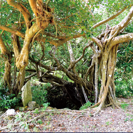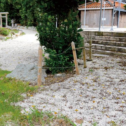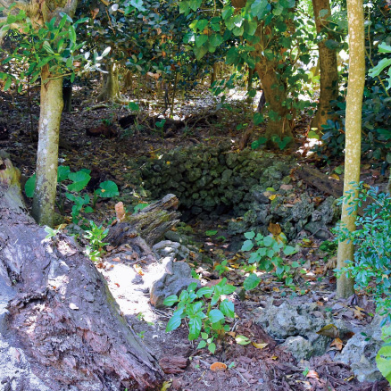 玻座間村を東西に分けるナビンドー道を境とするシュッタヌカク遺跡と小城盛は、竹富島の集落の歴史を探るうえでとても重要な遺跡です。東側に位置するシュッタヌカクは、竹富島を統一した根原金殿ゆかりの地としてその末裔が管理しています。また、西側の小城盛周辺は村番所が置かれていたこともあり、解明が進んでいます。