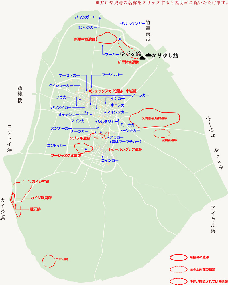 ハナックンガー(花城井戸)を境に新里村東遺跡の西側に位置する新里村西遺跡からは、多数の土器類、イノシシなどの小動物の骨ばかりでなく、竹富島の景観の草創期ともいえるグック(石垣)の遺構や柱穴などが出土されています。遺構は紀元1300年代後半から1400年代にかけてと推測されています。